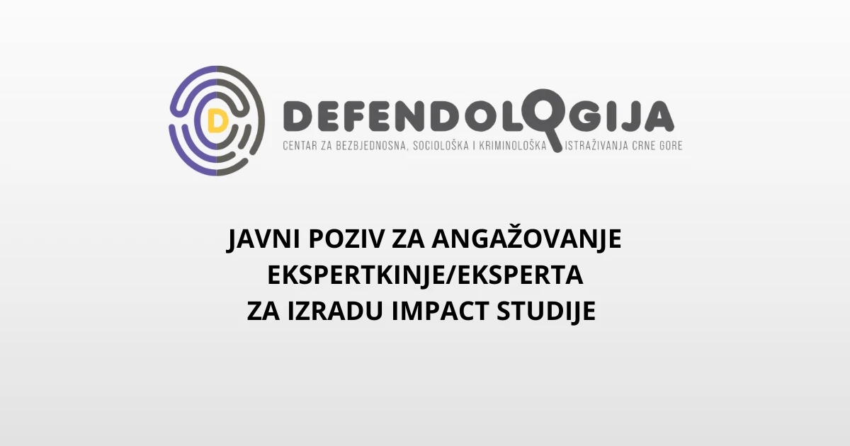 Centar za bezbjednosna, sociološka i kriminološka istraživanja Crne Gore „Defendologija Centar“ objavljuje Javni poziv za angažovanje ekspertkinje ili eksperta za izradu IMPACT studije o djelovanju i efektima Dnevnog centra/servisa koje Centar pruža djeci, roditeljima i porodicama u stanju potrebe.